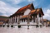 Wat Suthat วัดสุทัศน์เทพวราราม The temple is located on Bamrung Muang Road. It took 27 years, during the reigns of the first three kings of the Chakri Dynasty, to complete the construction. This temple is noted for its 19th century murals. The Viharn (preaching hall) should be seen for its collection of gilded Buddha images. The temple used to house a huge door with intricate carving, The temple complex is open daily from 9.00 a.m. to 5.00 p.m.. In front of the temple is the Giant Swing or Sao Ching Cha where a Brahmanic ceremony had taken place until the early 20th century. Many shops near the Giant Swing stock a very comprehensive range of Buddhist religious supplies.